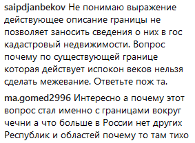 "Интересно, а почему этот вопрос встал именно с границами вокруг Чечни. А что, больше в России нет других республик и областей? Почему-то там тихо", - отметил ma.gomed2996.