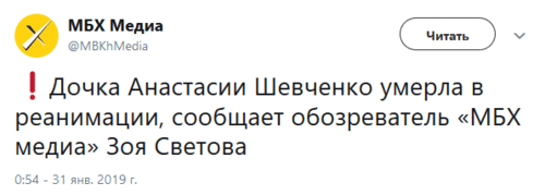 "Дочка Анастасии Шевченко умерла в реанимации", - сообщило сегодня в Twitter издание "МБХ медиа" со ссылкой на своего обозревателя Зою Светову.
