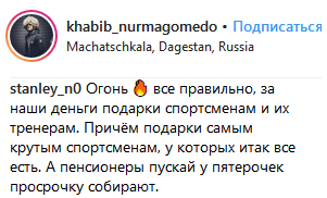 Авторы некоторых из них позавидовали Абдулманапу Нурмагомедову, другие сочли подарок заслуженным, а некоторые напомнили о дотациях Чечне. "Это подарок налогоплательщиков", – отметил пользователь kurbanlife.