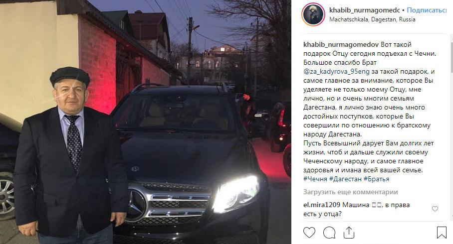 Хабиб Нурмагомедов вечером 5 февраля опубликовал на своей странице в Instagram фото отца на фоне нового автомобиля и поблагодарил Кадырова за такой подарок. Меньше чем за сутки пост Хабиба Нурмагомедова набрал 760 тысяч "лайков", под ним опубликовано более 6,6 тысячи комментариев.