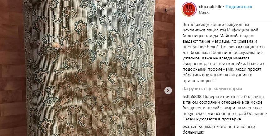 Как писал "Кавказский узел", сообщение о том, что пациентам инфекционного отделения Центральной районной больницы города Майский выдают грязные матрасы, покрывала и постельное белье, вызвало бурное обсуждение пользователей Instagram. При этом многие из комментаторов заявили, что подобную картину можно наблюдать и в других медучреждениях республики. К интернет-дискуссии подключился и Минздрав Кабардино-Балкарии, сообщив, что темные пятна на матрасах, которые "постоянно закупаются и стерилизуются", остались после чистки.