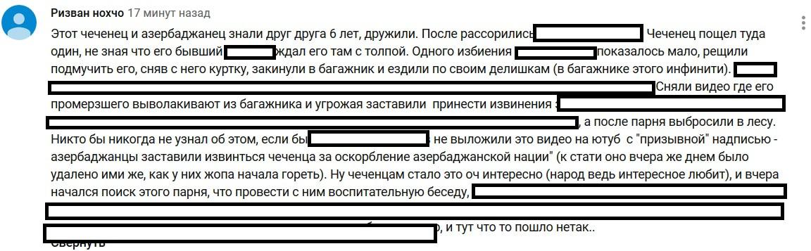 "Этот чеченец и азербайджанец знали друг друга шесть лет, дружили. После рассорились и [решили встретиться]. Чеченец пошел туда один, не зная, что его бывший [друг] ждал его там с толпой. Одного избиения показалось мало, решили помучить его, сняв с него куртку, закинули в багажник и ездили по своим делам, а потом бросили в лесу", - рассказал пользователь.