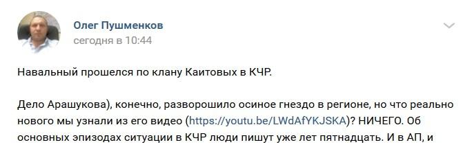 Видео вызвало отклики и в других социальных сетях. "Дело Арашукова, конечно, разворошило осиное гнездо в регионе, но что реально нового мы узнали из видео [Навального]? Ничего. Об основных эпизодах ситуации в КЧР люди пишут уже лет пятнадцать", - написал на своей странице в соцсети "ВКонтакте" Олег Пушменков.