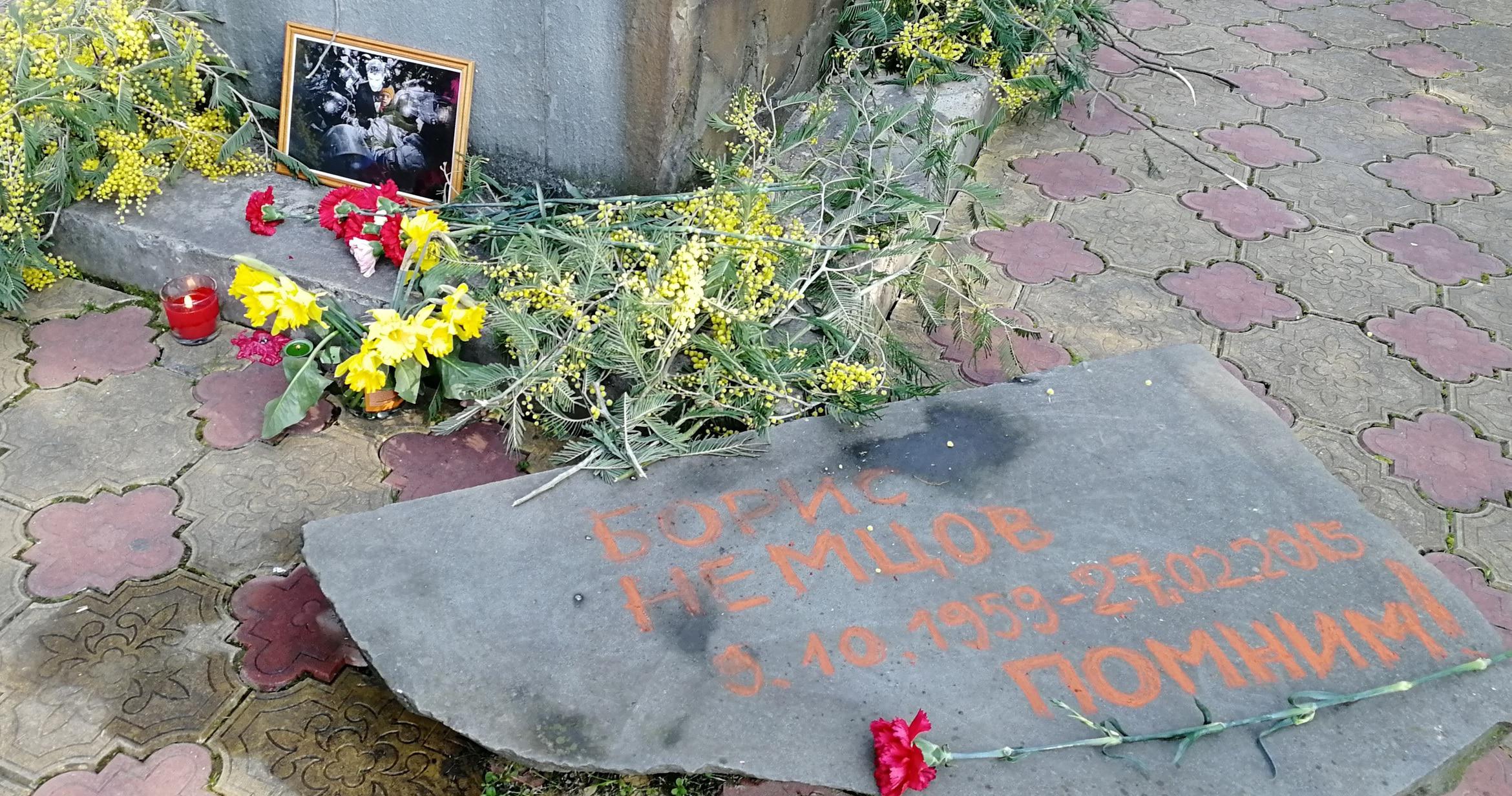 Люди несли до вечера цветы, зажигали свечи и стояли, тихо склонив головы, у портрета Немцова, передает корреспондент "Кавказского узла".