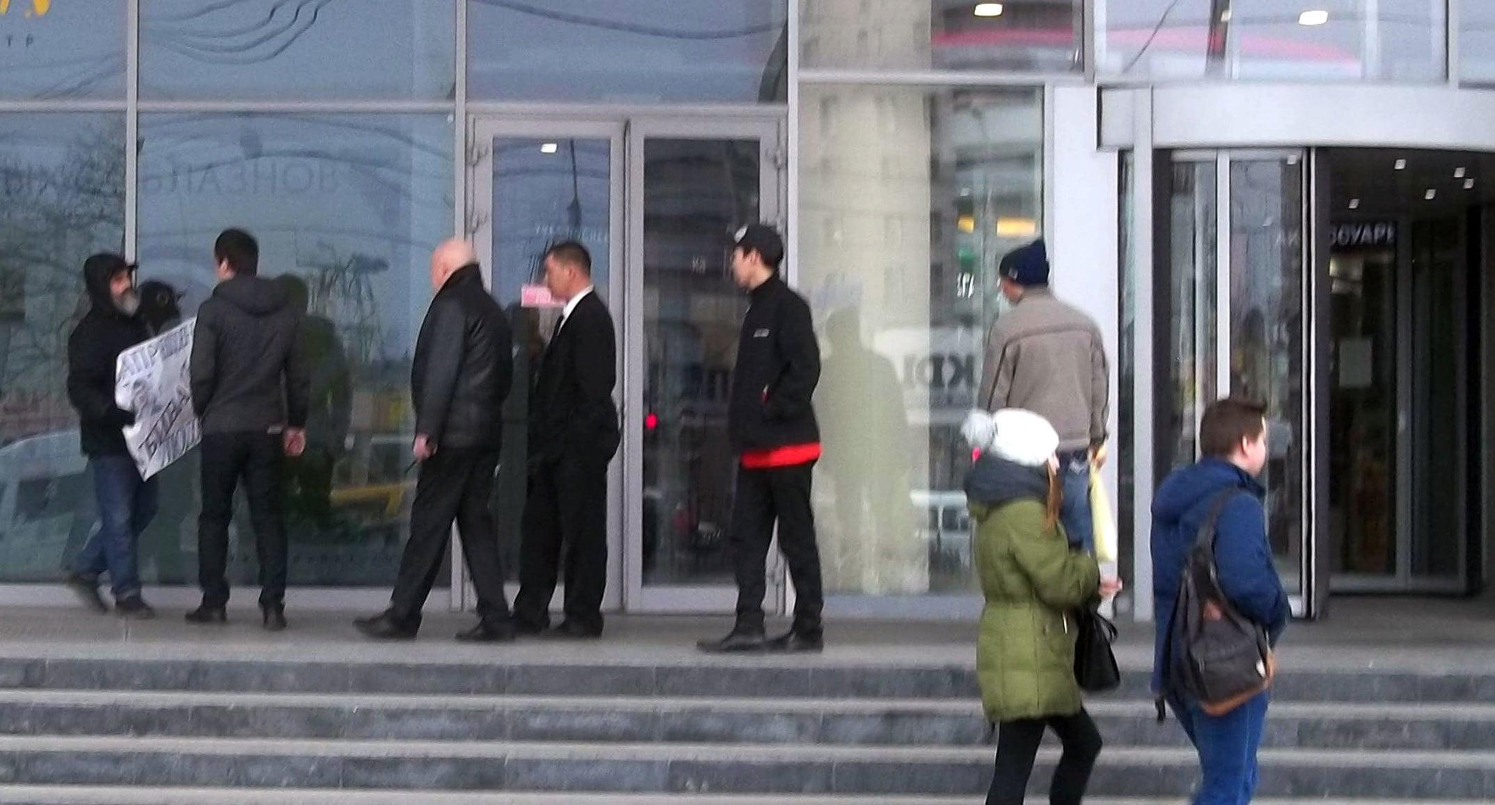 Серия одиночных пикетов около торгового центра на Вокзальной площади, в одной из самых оживленных точек города, началась в 14.00 по местному времени (13.00 мск). Почти сразу пикетчику Михаилу Анисенко попыталась помешать охрана ТЦ.