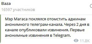 "Мэр Магаса поклялся отомстить админам анонимного телеграм-канала. Через 2 дня в канале опубликовали извинения. Первые анонимные извинения в Telegram", - говорится в сообщении этого же канала от 15 марта.