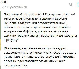 Автор поста о Беслане Цечоеве опубликовал "бездоказательные обвинения в ярко выраженной негативной и экспрессивной форме", признала 15 марта редакция Telegram-канала "338", который имеет 35 739 подписчиков. С этим автором прекращено сотрудничество, он лишен доступа к ресурсу за систематические нарушения "морально-этической составляющей в материалах" и отсутствие раскаяния. Уволенный автор специализировался на внутренней политике регионов Северного Кавказа, поэтому после его ухода, как сообщил канал, эти темы не будут глубоко затрагиваться.