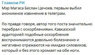 "Мэр Магаса Беслан Цечоев первым выбил анонимное извинение в Телеграм. По правде говоря, автор того поста значительно перебрал с оскорблениями. Кавказской аудиторией подобные оскорбления воспринимаются довольно болезненно и негативно отражаются на имидже силовиков, который и без этого хромает на обе ноги", - говорится в сообщении "Главком РИ" от 15 марта.
