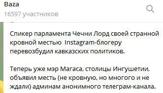 "Спикер парламента Чечни Лорд своей странной кровной местью Instagram-блогеру перевозбудил кавказских политиков. Теперь уже мэр Магаса, столицы Ингушетии, объявил месть (не кровную, но многого и не ждали) админам анонимного телеграм-канала", - написал Telegram-канал Baza 13 марта.
