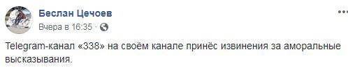 Беслан Цечоев подтвердил, что видел извинения редакции Telegram-канала "338". "Telegram-канал "338" на своём канале принёс извинения за аморальные высказывания", - написал он 15 марта на своей странице в Facebook.
