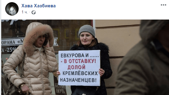 26 марта на Невском проспекте в Санкт-Петербурге состоялся одиночный пикет Хавы Хазбиевой, сообщил в тот же день Telegram-канал "Главком РИ". На фотографиях, опубликованных Хазбиевой на ее странице в Facebook, она попеременно стоит с разными плакатами: "Евкурова и ... - в отставку! Долой кремлевских назначенцев!", "Ингушетия против узурпаторов и коррупционеров у власти!", "Верните нашу землю!" и еще одним, с призывом вернуть республике отторгнутую у нее территорию.