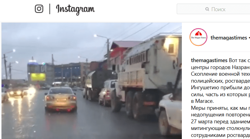 В Назрани и Магасе сегодня появились колонны военной техники и большие группы силовиков. Власти стремятся запугать протестующих перед новым митингом, считают пользователи соцсетей.