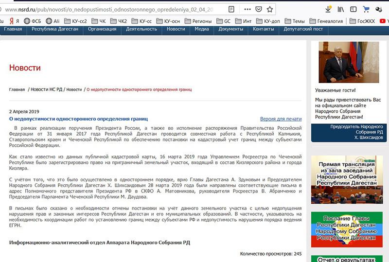 Как писал "Кавказский узел", 16 марта Чечня в одностороннем порядке зарегистрировала за собой спорный участок земли на границе с Дагестаном. 2 апреля парламент Дагестана на своем официальном сайте заявил "о недопустимости одностороннего определения границ" и сообщил, что спикер парламента Хизри Шихсаидов и премьер Дагестана Артем Здунов 28 марта направили соответствующие письма полпреду президента в СКФО, главе Росреестра и в парламент Чечни. Вечером 2 апреля это сообщение исчезло с сайта парламента Дагестана.
