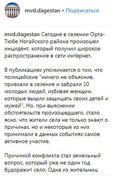 Согласно данным МВД, полицейские приехали в село, чтобы забрать в отделение для выяснения всех обстоятельств четырех участников драки с трактористом. "Мужчина после побоев направился в отдел полиции и написал заявление о случившемся", - говорится в сообщении от 12 апреля на странице МВД Дагестана в Instagram.