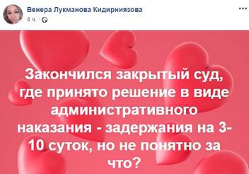 "Закончился закрытый суд, где принято решение в виде административного наказания - задержания на 3-10 суток, - написала Венера Кидирниязова, которая в информации о себе указала, что работает в школе села Ортатюбе и в газете "Голос степи".