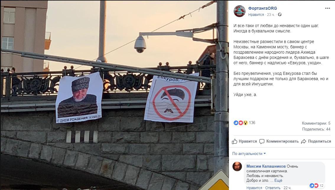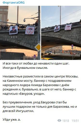 "Неизвестные разместили в самом центре Москвы, на Каменном мосту, баннер с поздравлением народного лидера Ахмеда Барахоева с днём рождения и, буквально в шаге от него, баннер с надписью "Евкуров, уходи". Без преувеличения, уход Евкурова стал бы лучшим подарком не только для Барахоева, но и для всей Ингушетии", - говорится в сообщении канала от 19 апреля. Здесь же размещены фотографии баннеров на мосту.