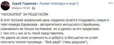 По мнению Муцольгова, день рождения Барахоева является поводом напомнить об активисте. "Сегодня, 19 апреля, Ахмеду исполнилось 65 лет. Не знаю, празднует ли он свой день рождения вообще, но сегодня для нас это повод напомнить об Ахмеде окружающим. Ахмед Барахоев - старейшина, входит в Ингушский комитет национального единства, в Совет тейпов ингушского народа, с самого первого дня, с сентября 2018 года, несмотря на неудовлетворительное состояние своего здоровья, находится в рядах народного протестного движения и является одним из самых активных его участников", - отметил Магомед Муцольгов.