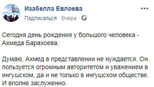 О дне рождения Ахмеда Барахоева в соцсетях написали и другие ингушские активисты. Так, Изабелла Евлоева отметила, что старейшина вполне заслуженно "пользуется огромным авторитетом и уважением в ингушском, да и не только в ингушском обществе". "Так получилось, что свой 65-й юбилей он встречает в камере ИВС Нальчика. Я знаю, что там нелегко, но я также знаю, что Ахмеда не сломит это обстоятельство на пути к цели. Вот и я горжусь знакомством с вами и возможностью работать бок о бок. Вы обязательно выйдете на свободу, и это лишь вопрос времени", - написала на своей странице в Facebook Евлоева.