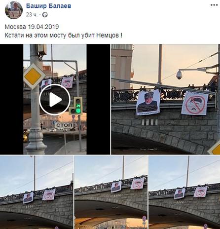 Несколько фотографий с Каменного моста в Москве с баннерами с надписями "С днем рождения, Ахмед" и "Евкуров, уходи", а также видео оттуда опубликовал на своей странице в Facebook Башир Балаев.