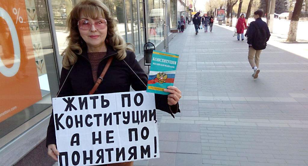 Участница пикета Любовь Третьякова держала плакат: "Жить по Конституции, а не по понятиям". "Если на Украине есть конкуренция, то в России она полностью отсутствует на выборах. Порошенко допускает конкурента Зеленского, допускает его выходки. А наш оппозиционер Навальный - его близко власть к выборам не подпускает. У нас давно нет демократических выборов, одна показуха и ложь", - заявила активистка корреспонденту "Кавказского узла".