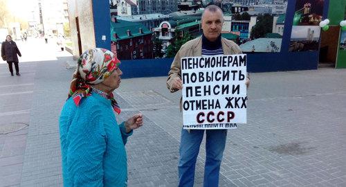 Четвертый участник пикетов, активист Владимир Тельпук, стоял с плакатом: "Пенсионерам повысить пенсии". "Выступаю против пенсионной реформы. Грабеж народа – пенсии относительно инфляции снижаются, а пенсионный возраст увеличили. Крайней степени несправедливость", - сказал Владимир Тельпук корреспонденту "Кавказского узла".