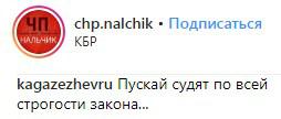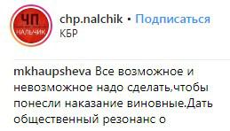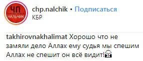 "Хорошо, что не замяли дело. Аллах ему судья. Мы спешим, Аллах не спешит, он всё видит!" - написал 4 апреля пользователь соцсети Instagram takhirovnakhalimat в группе "ЧП/Нальчик" под новостью о том, что дело о резонансном убийстве дошло до суда.