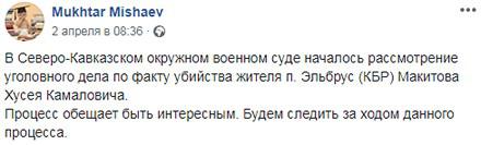 "В Северо-Кавказском окружном военном суде началось рассмотрение уголовного дела по факту убийства жителя п. Эльбрус (КБР) Макитова Хусея Камаловича. Процесс обещает быть интересным. Будем следить за ходом данного процесса", - написал 2 апреля адвокат из Нальчика Мухтар Мишаев на своей странице в Facebook.