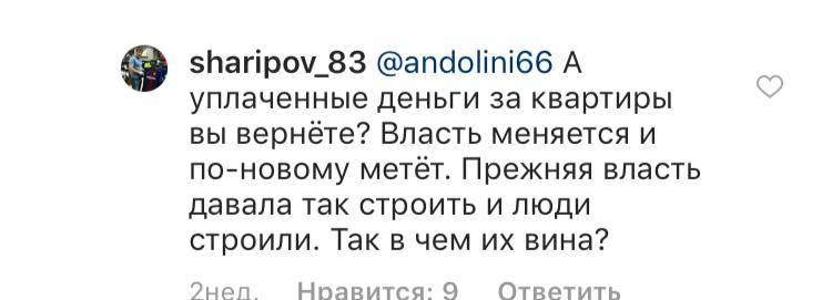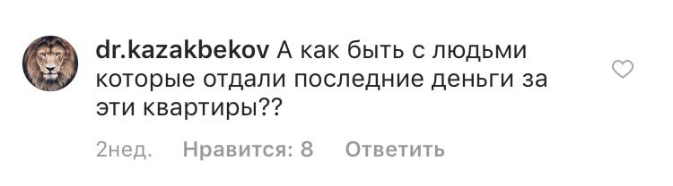 "А заплаченные деньги за квартиры вы вернете? Власть меняется и по-новому «метет». Прежняя власть давала так строить, и люди строили. Так в чем их вина?" - написал в комментариях sharipov_83.