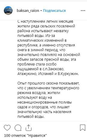 К лету подготовлены все водозаборные станции, проведена ревизия магистральных и уличных разводящих линий водопроводных сетей для устранения лишних потерь, говорится в сообщении главы Баксанского района Артура Балкизова, размещенном 17 мая на странице районной администрации в социальной сети Instagram. Однако из-за бесснежной зимы в этом году запас питьевой воды ограничен, отметил он.