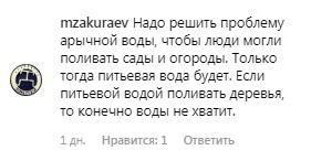 "Надо решить проблему арычной воды, чтобы люди могли поливать сады и огороды. Только тогда питьевая вода будет. Если питьевой водой поливать деревья, то, конечно, воды не хватит", - написал пользователь mzakuraev.
