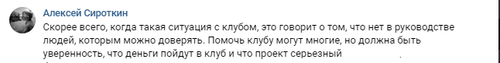 "Когда такая ситуация с клубом, это говорит о том, что нет в руководстве людей, которым можно доверять. Помочь клубу могут многие, но должна быть уверенность, что деньги пойдут в клуб и что проект серьезный", - заявил Алексей Сироткин.