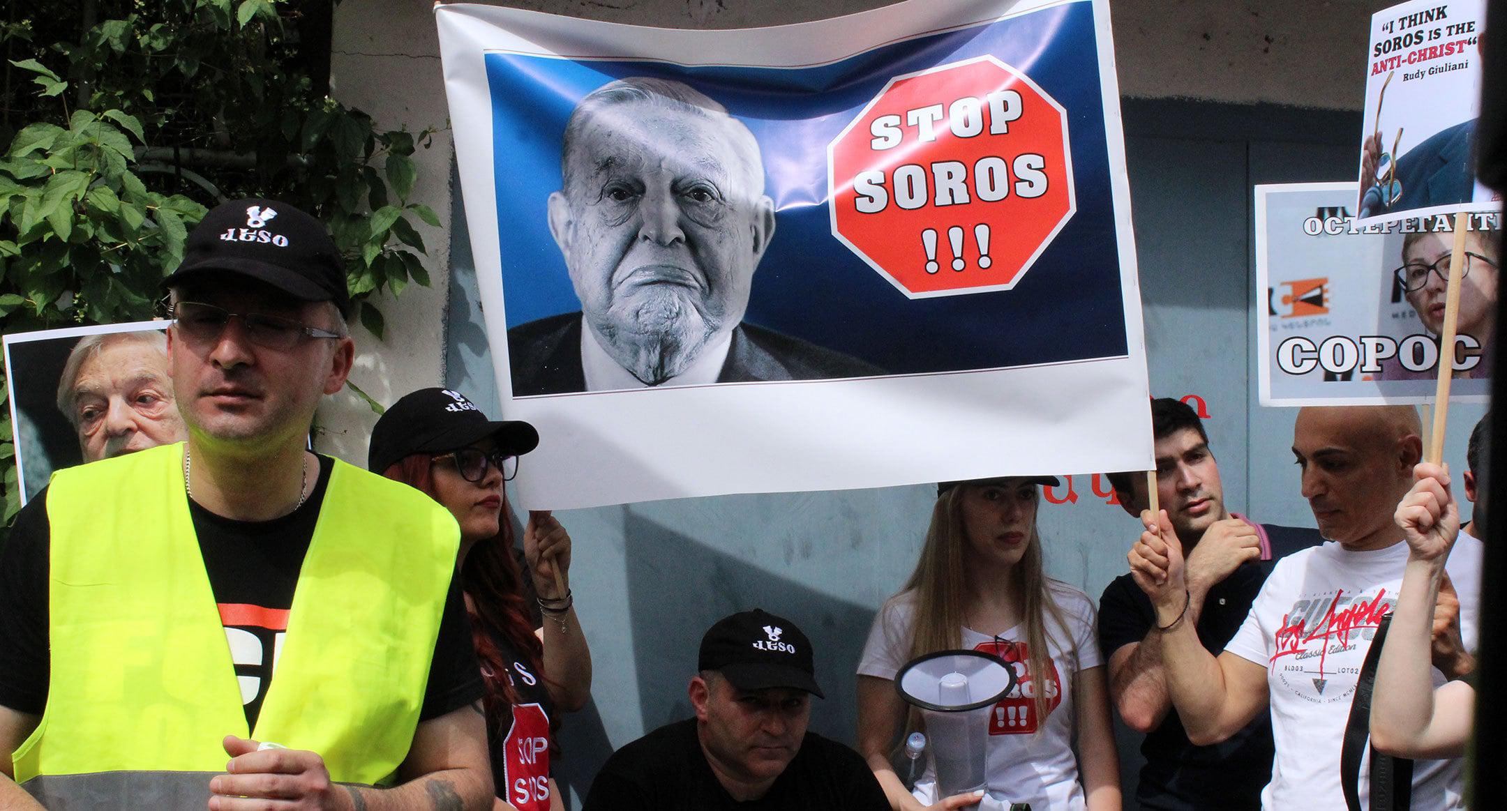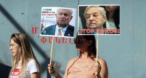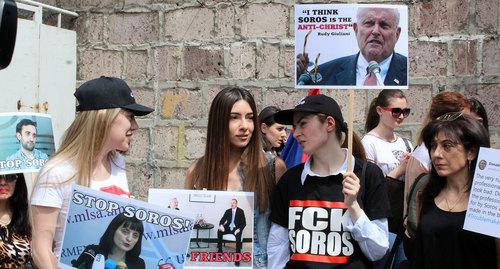 Участники протеста держали в руках плакаты с надписями "Стоп Сорос!", "Остерегайтесь, Сорос!" и фотографии Джорджа Сороса, руководителя армянского филиала фонда Ларисы Минасян, а также некоторых чиновников, которые, по мнению активистов, всегда получали непосредственное финансирование от "Фонда Сороса".
