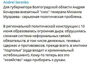 «Для губернатора Волгоградской области Андрея Бочарова внезапный "снос" генерала Михаила Музраева - серьезная политическая проблема. В региональной политической конструкции с 10 июня образовалась огромная дыра, обрушилась сложная система неформальных связей, обязательств, в том числе денежных, теневых сдержек и противовесов, прежде всего, в элитном "подполье" (куда входит и криминальный истеблишмент)», - написал 11 июня в своем Telegram-канале Андрей Серенко.