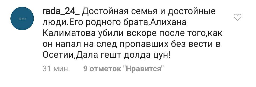 "Достойная семья и достойные люди. Его родного брата, Алихана Калиматова, убили вскоре после того, как он напал на след пропавших без вести в Осетии", - написал пользователь Instagram rada_24_.