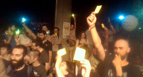 Затем толпа протестующих подошла к дому Иванишвили, там они показали неформальному лидеру Грузии "желтую карточку". На месте участники митинга повторили, что их мирный протест не прекратится до тех пор, пока министр внутренних дел не уйдет в отставку.