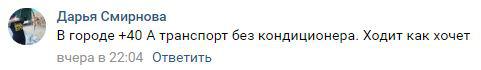 "В городе +40 (градусов), транспорт без кондиционера. Ходит, как хочет", - ответила пользователь Дарья Смирнова.