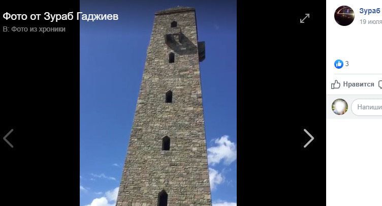 Фото башни, построенной в средневековом стиле, опубликовал 18 июля на своей странице в Facebook историк, представитель общественной комиссии по уточнению границ Дагестана и Чечни Зураб Гаджиев. Он охарактеризовал строение как "башню-новостройку, возведенную соседями на дагестанской земле".