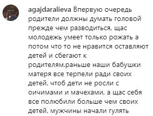 «В первую очередь родители должны думать головой, прежде чем разводиться. Сейчас молодежь умеет только рожать, а потом что-то не нравится - оставляют детей и сбегают к родителям. Раньше наши бабушки, матери все терпели ради своих детей, чтоб дети не росли с отчимами и мачехами, а сейчас себя все полюбили больше, чем своих детей», - рассуждает agajdaralieva.