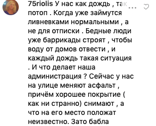 "У нас как дождь, так потоп. Когда уже займутся ливневками нормальными, а не для отписки. Бедные люди уже баррикады строят, чтобы воду от домов отвести, и каждый дождь такая ситуация. И что делает наша администрация? Сейчас у нас на улице меняют асфальт, причём хорошее покрытие (как ни странно) снимают, а что на его место положат, неизвестно", - пишет 75riolis.