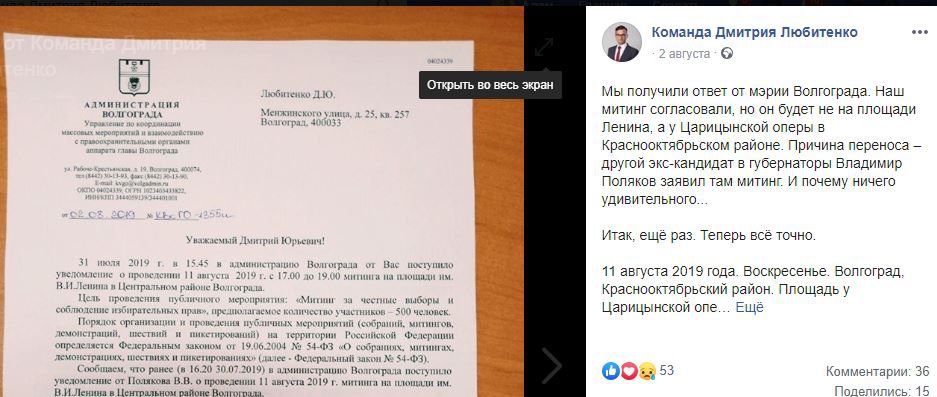 Согласованный митинг Дмитрия Любитенко пройдет в предложенном волгоградской мэрией месте, поскольку в это время на площади Ленина в центре города пройдет другая акция протеста незарегистрированного кандидата на губернаторские выборы Владимира Полякова, говорится в ответе администрации Волгограда от 2 августа, копия которого имеется в распоряжении "Кавказского узла".