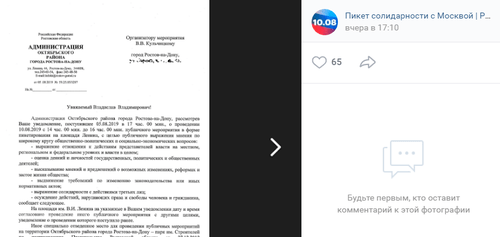 На запрос ростовских активистов провести пикет на площади Ленина 10 августа в мэрии ответили отказом, сославшись на то, что в этот день на ней уже согласовано проведение другого мероприятия, передает Donnews. Чиновники предложили активистам провести пикет в Левенцовке, на пересечении улицы Доватора и переулка Гарнизонного, говорится в размещенной 6 августа копии ответа мэрии в группе "Пикет солидарности с Москвой. Ростов-на-Дону" в соцсети "ВКонтакте". В документе отмечается, что в этом месте удобное транспортное сообщение, а также есть возможность обеспечить безопасность всем участникам акции.