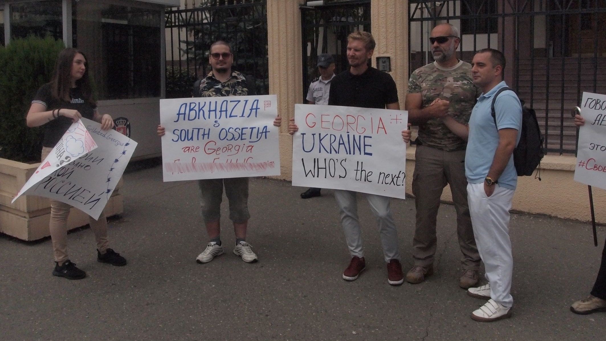 На плакатах, которые держали активисты, они написали обвинения в адрес России. Два плаката были на английском языке: "Грузия. Украина. Кто следующий?" и "Абхазия и Южная Осетия – это Грузия".