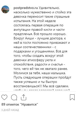 К девочке постоянно приезжают в гости жители республики, сообщили в постпредстве Ингушетии при президенте России. "На этой неделе состоялась первая операция по ампутации правой кисти и части предплечья. Всё прошло хорошо. Вокруг [девочки] - лучшие доктора, к ней в гости постоянно приезжают и наши соотечественники - с подарками и угощениями", - написали 11 августа на странице постпредства в соцсети Instagram. К 12.30 мск сегодня пост набрал 89 лайков.
