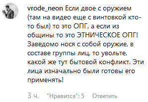 "Если двое с оружием (там на видео еще с винтовкой кто-то был,) то это ОПГ, а если из общины, то это этническое ОПГ! Заведомо нося с собой оружие, в составе группы лиц, то увольте, какой же тут бытовой конфликт", – написал vrode_neon.
