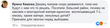 "Дворец театров скоро развалится, пока они будут с ним что-то решать. Посетили Зольский район, почему не заехали к многодетной матери-одиночке, воспитывающей 7-х, никому, кроме матери, не нужных детей? Приехали для галочки перед выборами", - высказала свое мнение Ирина Кишева.