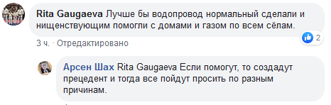 "Лучше бы водопровод нормальный сделали и нищенствующим помогли с домами и газом по всем селам", - поделилась мнением Rita Gaugaeva. "Если помогут, то создадут прецедент, и тогда все пойдут просить по разным причинам", - ответил ей пользователь Арсен Шах.
