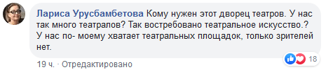 "Кому нужен этот Дворец театров. У нас так много театралов? Так востребовано театральное искусство? У нас, по-моему, хватает театральных площадок, только зрителей нет", - написала Лариса Урусбамбетова.