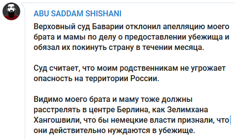 Тумсо Абдурахманов 4 сентября отреагировал на решение Верховного суда Баварии в своем Telegram-канале.
