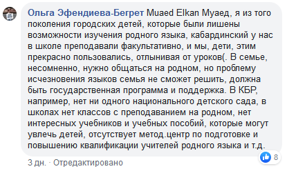 Соучредитель общественной организации "Очаг" Ольга Эфендиева-Бегрет из Кабардино-Балкарии 13 сентября на своей странице в Facebook отреагировала на комментарий пользователя Muaed Elkan, который признал, что его дочери "очень плохо знают родной язык". "Садик, соседки и почти все окружение влияют на это. И как бы ни пытался говорить с ними на адыгском, через полчаса, уже не замечая, говорю с ними по-русски", – посетовал он.