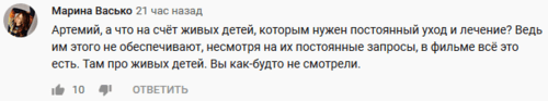 "Артемий, а что насчет живых детей, которым нужен постоянный уход и лечение? Ведь им этого не обеспечивают, несмотря на их постоянные запросы, в фильме [Юрия Дудя] все это есть. Там про живых детей. Вы как будто не смотрели", – обратилась к дизайнеру Марина Васько.
